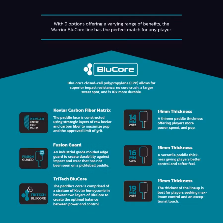 Modellen finns i tre olika varianter, Standard, Pro och Max samt i tre olika tjocklekar, 14, 16 och 19mm, så att du kan hitta den perfekta passformen för ditt spel. Oavsett om du är sugen på explosiv kraft, mångsidighet eller ultimat kontroll, så finns det en Warrior BluCore byggd för dig.
